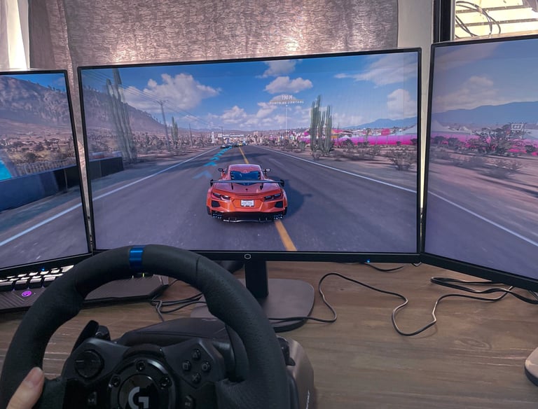 Simuladores de conducción (volante + pedales) con setup multi-monitor y asistencia técnica.